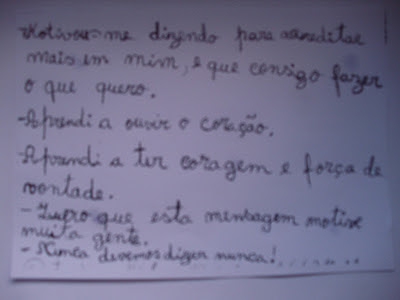 Após os recursos estarem ligados, projeção do vídeo (2/3 vezes). Seguiu-se a fase da sua discussão, entre os alunos. Sempre com a mínima intervenção, escreveram, após, o que quiseram, num quarto de folha, entretanto distribuída. Ilustraram, os que assim entenderam. Em seguida, cada um veio ler o que escrevera, havendo, então, lugar à apresentação mútua. Surgiu um episódio curioso e hilariante: um dos meninos, nesse cumprimento de boas-vindas, inclinou-se e beijou, respeitosamente, a mão da professora. Sim, repetiu-se a cena para registar em foto o momento. O clima que pretendia estava criado. Queria-os convencidos da sua capacidade e da competência relacional da sua professora. O caminho, que sempre está pejado de pedras, ficaria mais limpo, as pedras mal seriam notadas ou chutadas para canto.